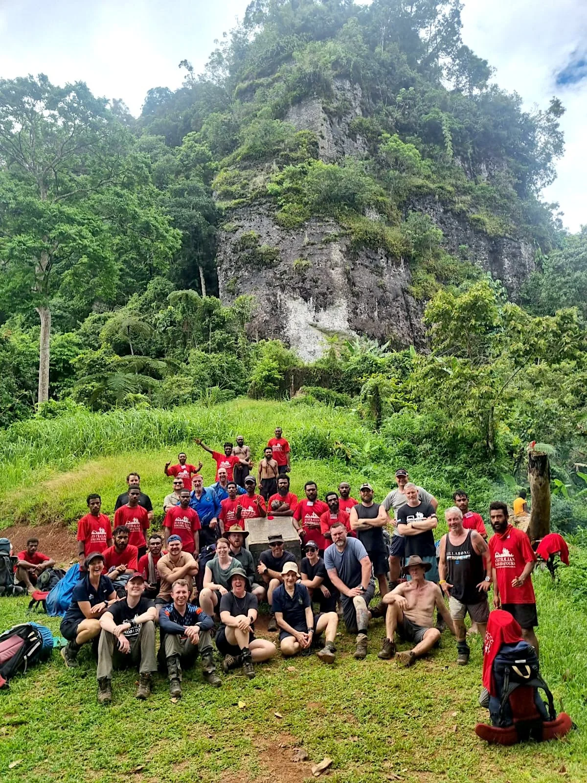 The crew started the day hiking down from Ioribaiwa village for an hour to Ua Ule Creek, where a few of the trekkers changed into their river shoes. They then trekked across the creek a dozen or so times, on the way to the Ua Ule creek camp for a break. After resting here they trekked straight back into the creek and crossed it another 1/2 dozen times for an hour on the way to the base of Imita Ridge. They then trekked up Imita for an hour and many said this was the toughest climb of the trek. (Photo as below) Imita Ridge was the final withdrawal of the main Australian army and this was the place they where told that they must make their final stand. Then they trekked down Imita ridge for an hour on the way to Goodwater village, where they rested and had a good break . The day was very hot however, the track was pretty slippery & muddy from the rain yesterday as they trekked another hour onto there “Goldie River” arriving at 2:30pm where they all enjoyed a good swim. They are now having their final dinner on the track and looking forward the finish line tomorrow.
